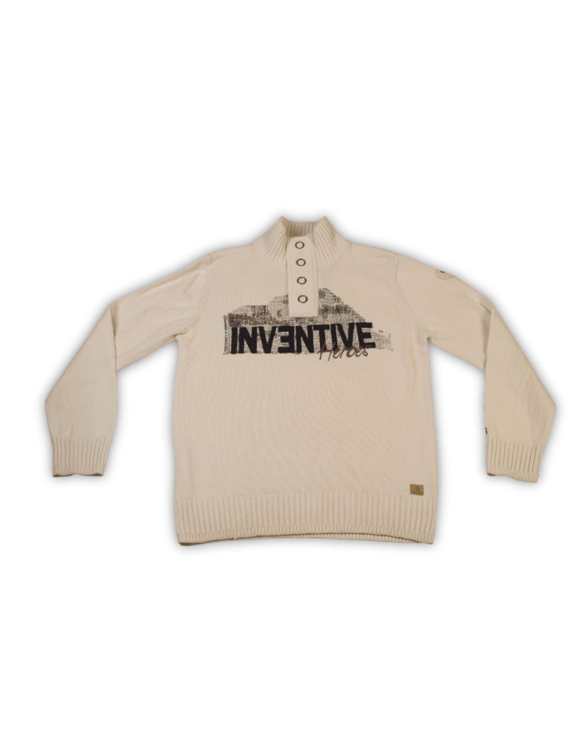 De robuuste knoopsluiting bij de hals, de rib gebreide boorden en tekst ‘Inventive Heroes’ zorgen voor een unieke uitstraling van deze tweedehands coltrui.